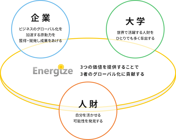 エナジャイズには、大学や研究機関との独自のネットワークが世界136カ国にあります。採用計画をクライアント毎に個別にプロデュースし、求める人財を全世界から発掘することができます。また、エナジャイズには国際経験が豊富なメンバーのみが所属しており、組織風土の多国籍化を当事者意識を持ってでサポートできるプロフェッショナル集団です。
